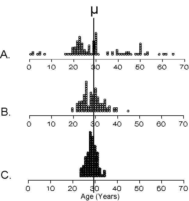 Sampling distribution A shows 100 AGE values chosen at random. This can be viewed as a distribution of sample means in which each sample has n = 1.