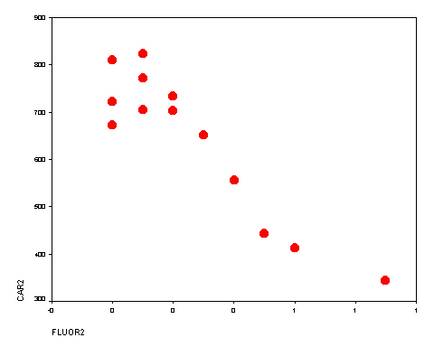 Interpretation: Relation linear? Not perfectly, but good enough for descriptive purposes. Correlation statistics: . Regression model: Comment: Although the fit of this model is not as good as model B, I prefer no model. The untransformed figure shows most clearly that the decline in cavity rates is steep in the 0 to 0.8 range. Since higher levels have only modest increases in benefit and potential toxicity, any action should be devoted to adding less than 1 ppm of fluoride to public water sources. |
