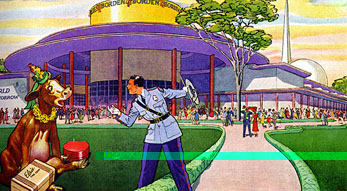 "Nonsense," chuckled the man. "You're going to have the time of your life here, living in 'The Dairy World of Tomorrow.' Why, you'll be in a lovely, air-conditioned Borden barn -- you'll still eat the finest food -- and you'll be milked on a merry-go-round . . . "