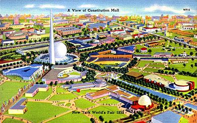 This 2000 ft. esplanade will be lined with hundreds of trees, shrubs and glowing fountains. Five picturesque lagoons with their beautiful waterfalls will make a charming background for some of the largest exhibit buildings, the Perisphere and Trylon, the largest sundial in the world, and several heroic creations of the sculptor's art.