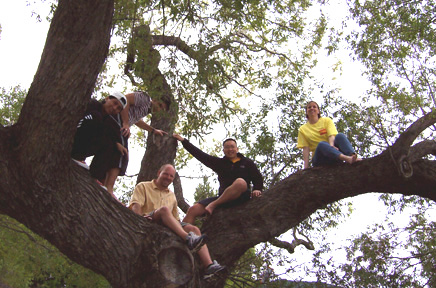 I saw a tree that I noticed yesterday as a great climbing tree so I couldn’t resist a good climb. A few minutes later Torsten joined me and we were able to coax Shariff up – actually, he kind of RAN up the tree – very cool! When Tommy and Joel found us, they joined in on our spontaneous team-building exercise – our childlike romp in the tree.