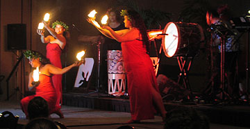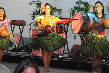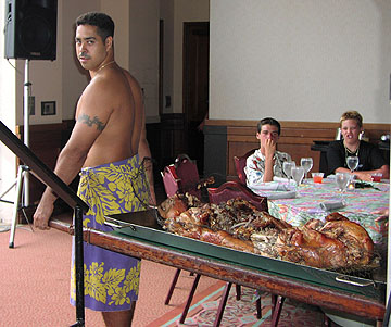 After the museum, we went by the local Hilo Hattie store and then back to the hotel to rest a bit before our big luau tonight. We went to the "Drums of Paradise" Luau at the Hyatt in Poipu. It wasn't what I expected in a Luau. I guess you could say it was a bit disappointing. I was expecting to be outside, on the beach, see an imu ceremony, which is when they take the roast pig out of the underground oven and eat Poi. Well, I got to eat poi, alright, but the luau was held in the grand ballroom of the hotel, and while that had one end completely open to the outside, it was far from the beach. Also, the pig had already been taken out of the oven and completely stripped of all the meat before they wheeled it out on a cart so we could take pictures of the empty carcass. Well, at least strapping island men carried the pig out! The entertainment was a bit cheesy, which we loved, but the dancing was very good. The food was fine and the pig really did taste good. There was lots of fresh fruit, which was great. All in all, it was a successful evening with a few disappointments. Next time, though, we will look harder for authenticity.