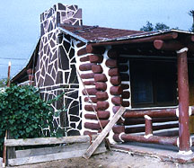 Heading west through town, Jenny catches sight of the Blue Spruce Lodge. Surrounding the roof is a slash of purple neon, while next to every door we find an ornate lamp edged with green plastic and iron swirls. On the road, pools of gasoline create drifts of almost incandescent color marred only by occasional raindrops. At the Cactus motel (where there is no real cactus to be seen), a pack of children play in an empty parking lot. Only the Log Cabin Motel is pretty much as it sounds - two rows of lavishly painted dark red cabins, edged in white. Inside, a large bedroom separates a bathroom on one end and a shower on the other. Rain falls from the overhang as we decide to keep going out of town toward the fabled teepees of Holbrook, Arizona.