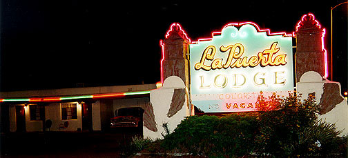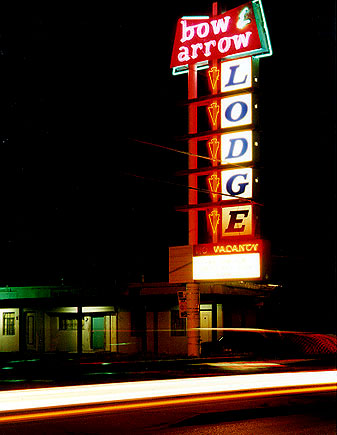 Jenny insists that we shoot the Bow & Arrow Lodge, even though the owners are pretty ornery about trespassing laws. So she stands in the median, waiting to sync the blinking arrows with the passing motorists, some of which whistle and beep their horns. Same sign at the Tewa Lodge, but the manager's really cool. He's been asked if folks can shoot his sign about a million times. We end up, like so many folks do, at La Puerta Lodge. A doorway to the nearby interstate, it's a place of shadows amidst the brilliant red and green neon lining the adobe facade. Mangy fellows keep their cigarettes tightly locked under sun-cracked wrinkles. Tall trees and bushy weeds grow out of a center courtyard that might have offered a smiling swimming pool years back.