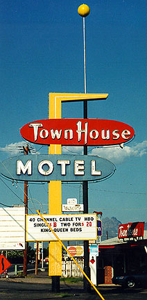 We're zooming across the interstate from California to Texas, pulling off I-10 in Deming just to get some gas. We only plan to leave a trail of dust after a moment or two, but when you find a Motel Drive, it's wise to drive slowly and get to know the town better. It's around five in the afternoon, no neon in site. But you can bet that, after dark, the galloping horses and pulsating stars are ready to cavort under the broad skies. Take our advice: if you've passed the sunset line and are trying to make time on the highway, pull off the interstate anyway and enjoy the show. Further east, in Las Cruces, we stop by the Townhouse Motel on another aptly named Motel Boulevard. An L shaped complex with red painted doors, the Townhouse is only one story high, but no one seems to care.