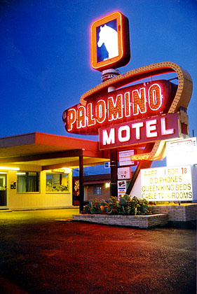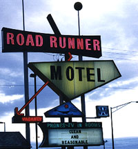Summer 1996: About halfway between Oklahoma City and Albuquerque, Tucumcari is one of those rare towns where the motel lights make you want to get out of the car and walk a while. The strip through town that used to be marked Route 66 is a delight of blinking, glowing, moving color. Having driven along the barbed wire through the mesas and the huge expanses of open land, we agree that it was worth it all just to come here for a while. At this point, we find out the proper pronunciation for the city: two come carry. In Route 66: The Mother Road, Michael Wallis recalls one of the more exotic stories behind the name: "It seems an Apache maiden named Kari, daughter of Chief Wauntonomah, was smitten by Tocom, a handsome young brave. When Tocom was killed by a rival, Kari is said to have stabbed her sweetheart's murderer and then taken her own life with the bloody knife. Wauntonomah was so distraught when he found out his daughter and future son-in-law were both dead, the chief seized Kari's knife and plunged it into his heart as he wailed his dying words, "Tocum! Kari!" Wallis is quick to remind us that more reasonable stories exist to explain the origin of Tucumcari. But surely, there are none more tragically romantic. Thinking on this, our own name presents itself to us. In the falling evening, we discover Motel Americana - or Americana Motel - depending on which side you face. According to a postcard I find in the office, this place used to be one of the Whiting Brothers Motels - a chain with links in Holbrook, Winslow, Flagstaff, and the Continental Divide.