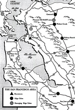 Silicon Valley is a perfect topic for this class because it is a wholly rhetorical creation. This map, borrowed Joel Garreau's (1991) Edge City provides one potential view of Silicon Valley. But, like all maps, this image tells more about the mapmaker than the territory. After all, there is no political boundary called "Silicon Valley." Since the term entered the public lexicon in the 1970s, various groups have struggled to "fix" the borders to this unique manifestation of public life. Yet, the boundaries keep changing!