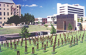 Well, after that experience, we traveled north to Oklahoma City to see the Murrah building memorial. We visited the OK City bombsite 4 years ago on our first Rt 66 trip and it was a beautiful site to see. There was a long chain link fence with all kinds of stuffed toys and things attached to it to remember all the people who died in the Murrah Building bomb. Now, they have built a magnificent memorial including a brass and glass chair for each person who died in the bomb.