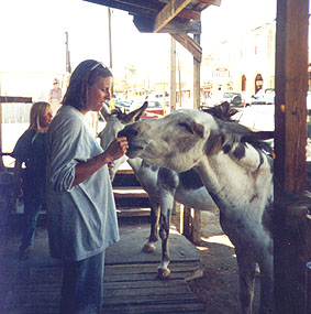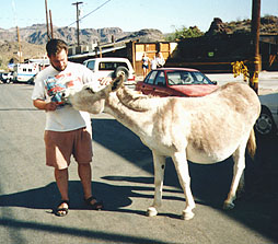 The most interesting spot of the day was Oatman, AZ. About 20 miles off of I-40, this old west mining town is most famous for its wild burrows wandering the streets begging tourists for food. A Plaque in town explains that if it weren't for the burrows, the town wouldn't be there. Many people have come for the burrows and stayed to buy this or that trinket. We brought in some carrots and had fun feeding these neat animals. Some had babies with them and others were pregnant. They could be pushy, at times, too. We certainly had a good time, here.