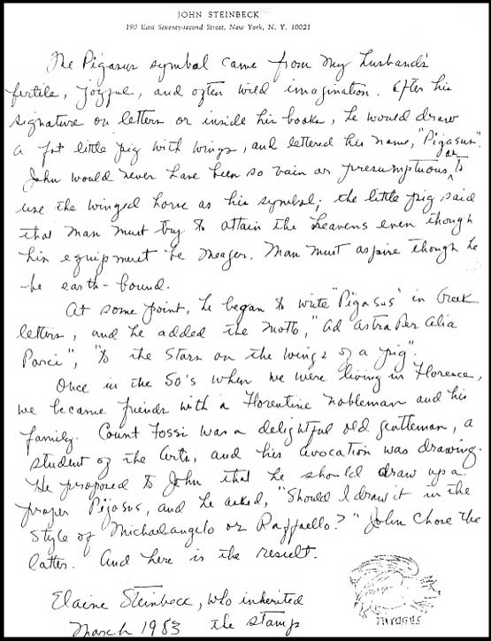 Below is Elaine Steinbeck's explanation of the origins of Steinbeck's trademark symbol: