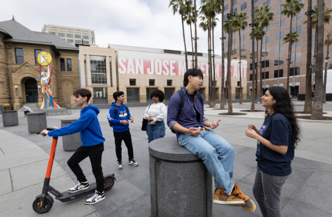 Students in the Plaza de Cesar Chavez in downtown San Jose.