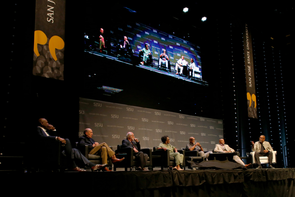 During three sessions, panelists reflected on the history and future of athlete activism. This October marks the 50th anniversary of the historic moment in athlete activism and SJSU history when Tommie Smith, ’69 Social Science, ’05 Honorary Doctorate, and John Carlos, ’05 Honorary Doctorate, raised their fists on the medal stand in Mexico City during the 1968 Olympics to protest racial inequality, drawing international attention to athlete activism and the core goals of the Olympic Project for Human Rights (OPHR).
